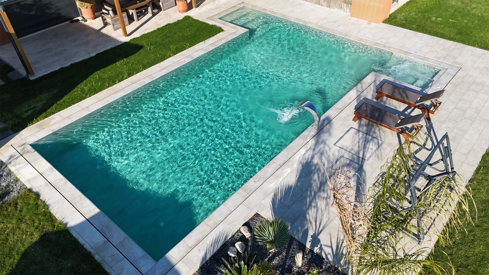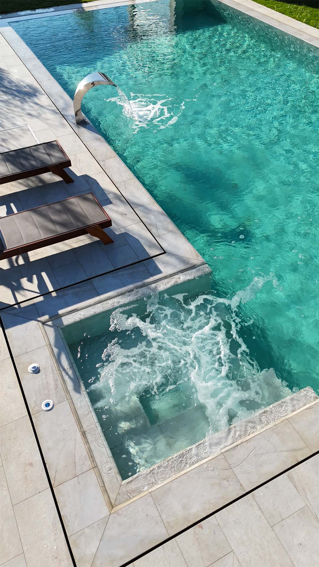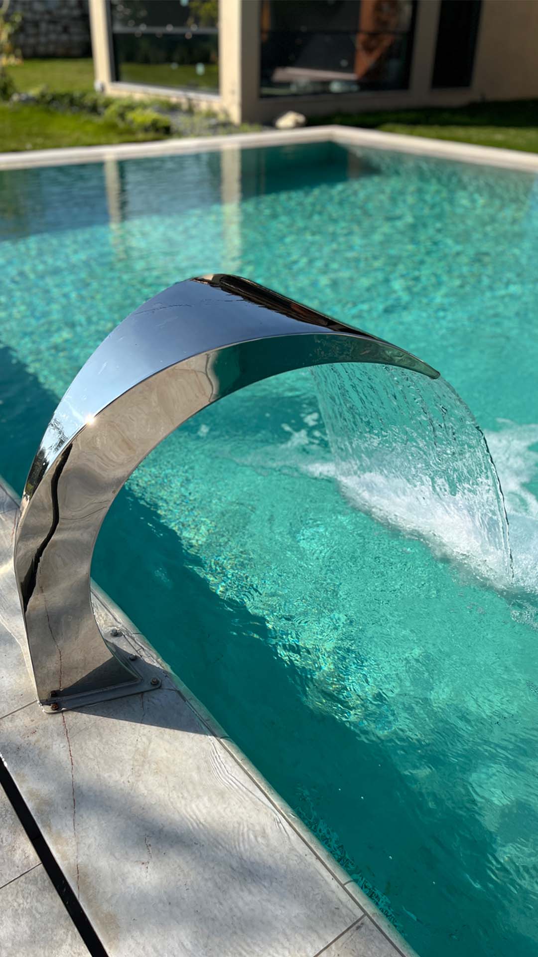 Havuzun keyif kullanımına yönelik olarak da özel detaylar eklendi. Tarafımızdan özel üretim olarak hazırlanan krom şelale, hem güçlü hem de zarif bir su akışıyla havuzun tasarımına premium bir dokunuş kattı. Ayrıca projede entegre jakuzi ve blower sistemi kurularak kullanıcıların masaj etkili bir hidromasaj deneyimi yaşaması sağlandı. Tüm bu bileşenler, havuzun sadece bir yüzme alanı olmaktan çıkıp, gerçek anlamda bir konfor ve dinlenme noktası haline gelmesine katkı sundu.