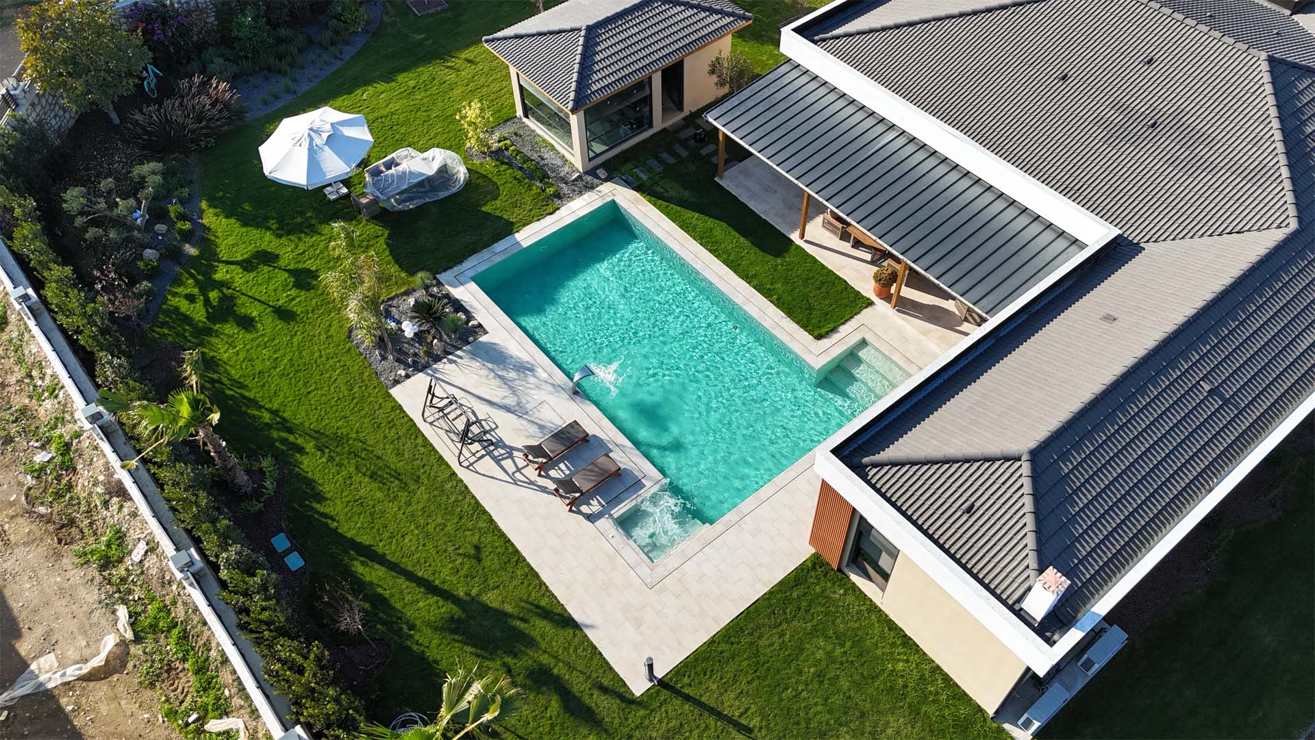 Mekanik altyapı kısmında ise verimlilik, sessiz çalışma ve uzun ömür hedeflendi. Bu doğrultuda filtrasyon sistemi Astralpool Victoria Plus pompa ve Astralpool Volcano kum filtresiyle kuruldu. Yüksek debi sağlayan Astralpool sistemleri, havuzun sürekli temiz ve sağlıklı kalmasını garanti altına alırken bakım ihtiyaçlarını minimuma indirdi. Dezenfeksiyon tarafında ise Zodiac eXo iQ tuz klor jeneratörü ve Zodiac Dual Link tercih edildi. Bu akıllı sistem, su kalitesini otomatik olarak kontrol ediyor, gerekli üretimi kendi hesaplıyor ve kullanıcıya uzaktan yönetim imkânı sağlıyor. Böylece havuz hem daha sağlıklı hem de daha düşük kimyasal tüketimiyle ekonomik hale geliyor.