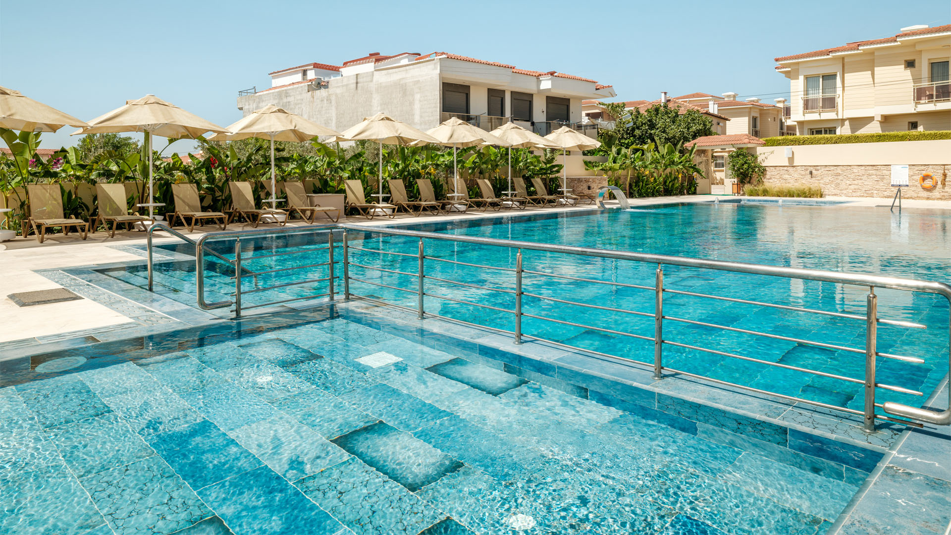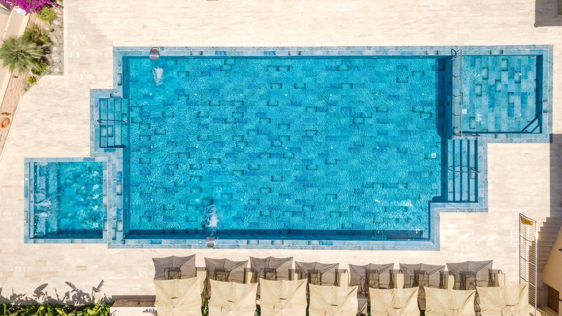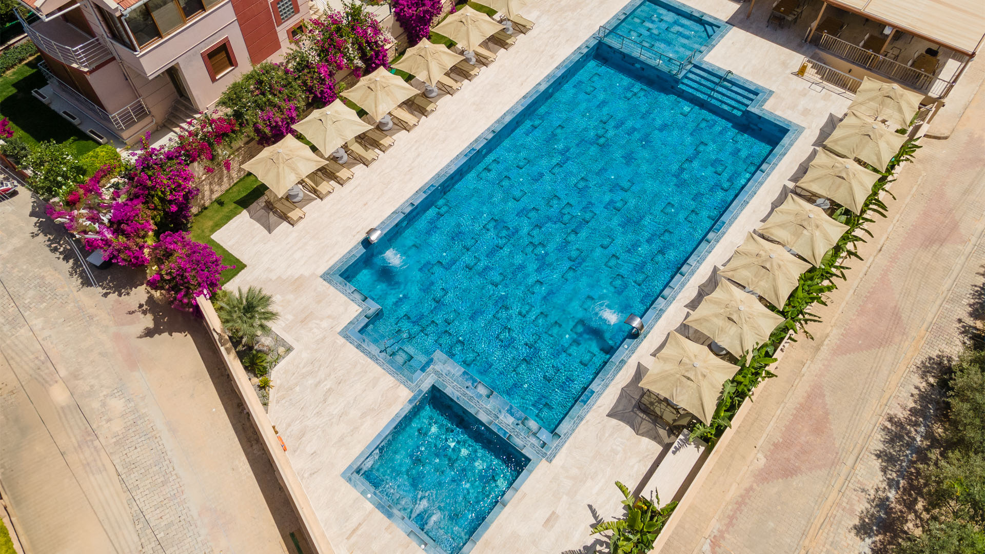 Bu süreçte otelin açık yüzme havuzunun yenilenmesi firmamız tarafından üstlenilmiştir. Projede hem estetik hem de dayanıklılığıyla öne çıkan Serapool Blue Bead porselen karo ve uyumlu yan parçaları tercih edilmiştir.