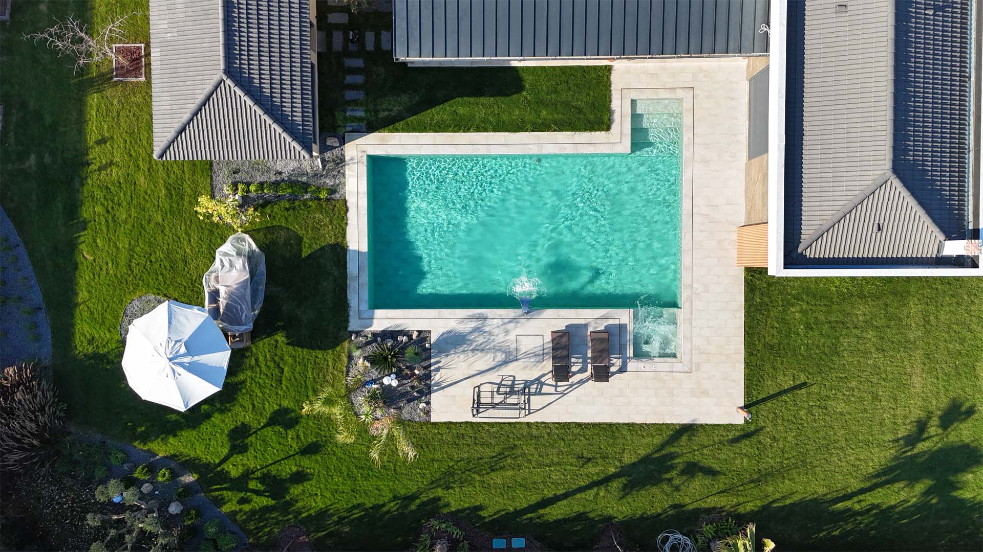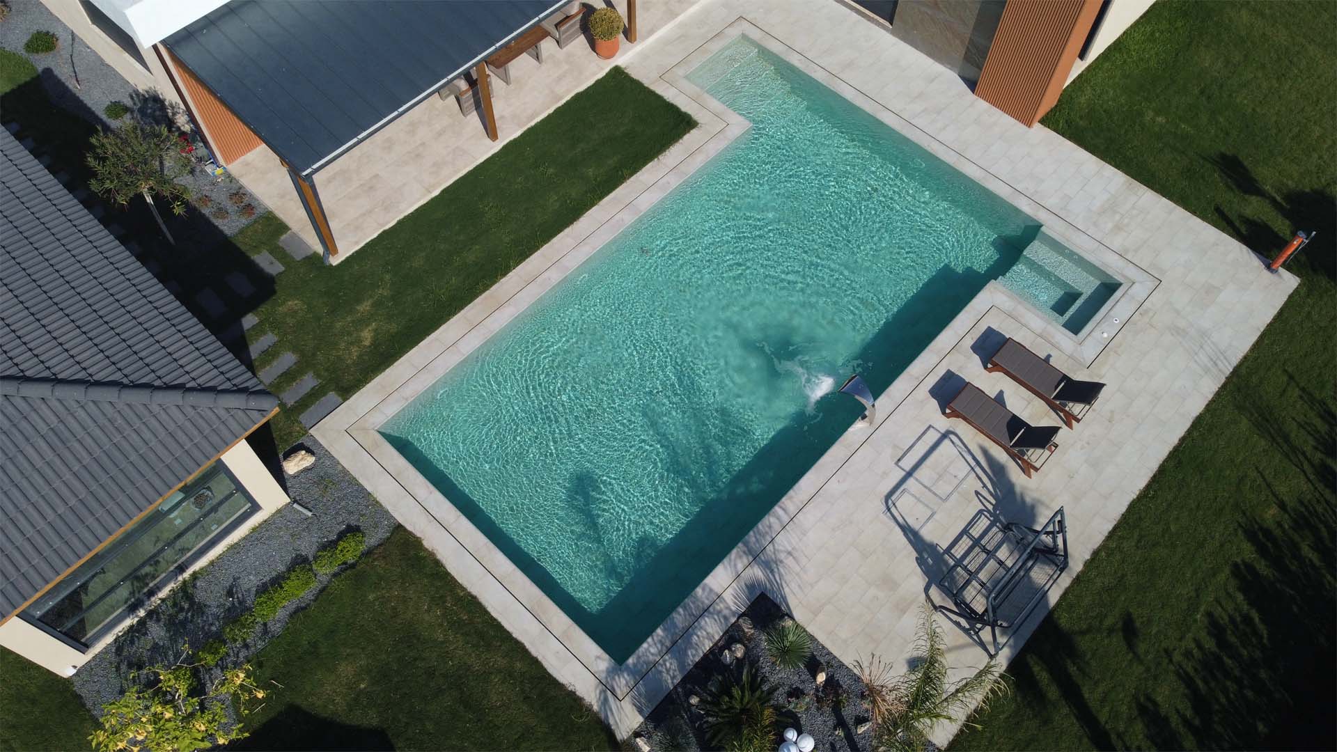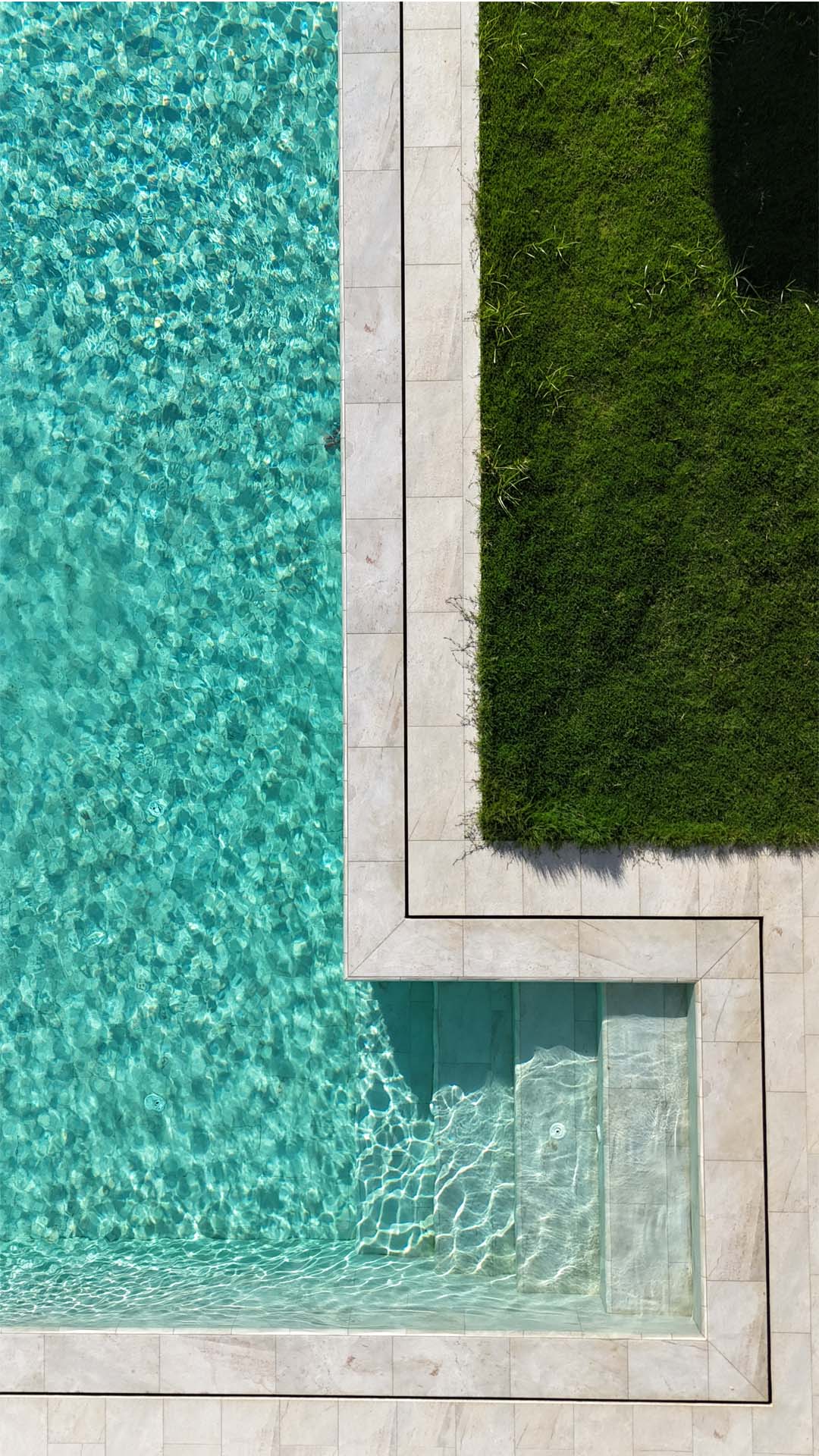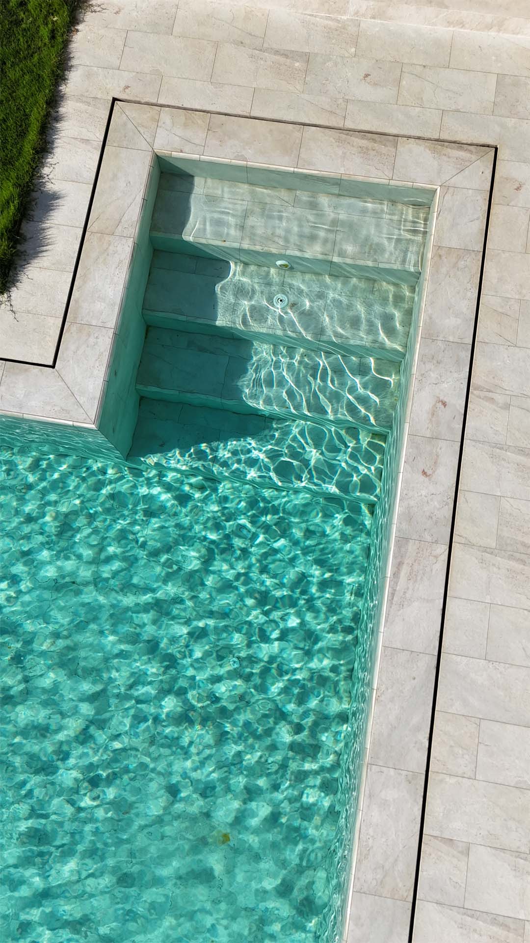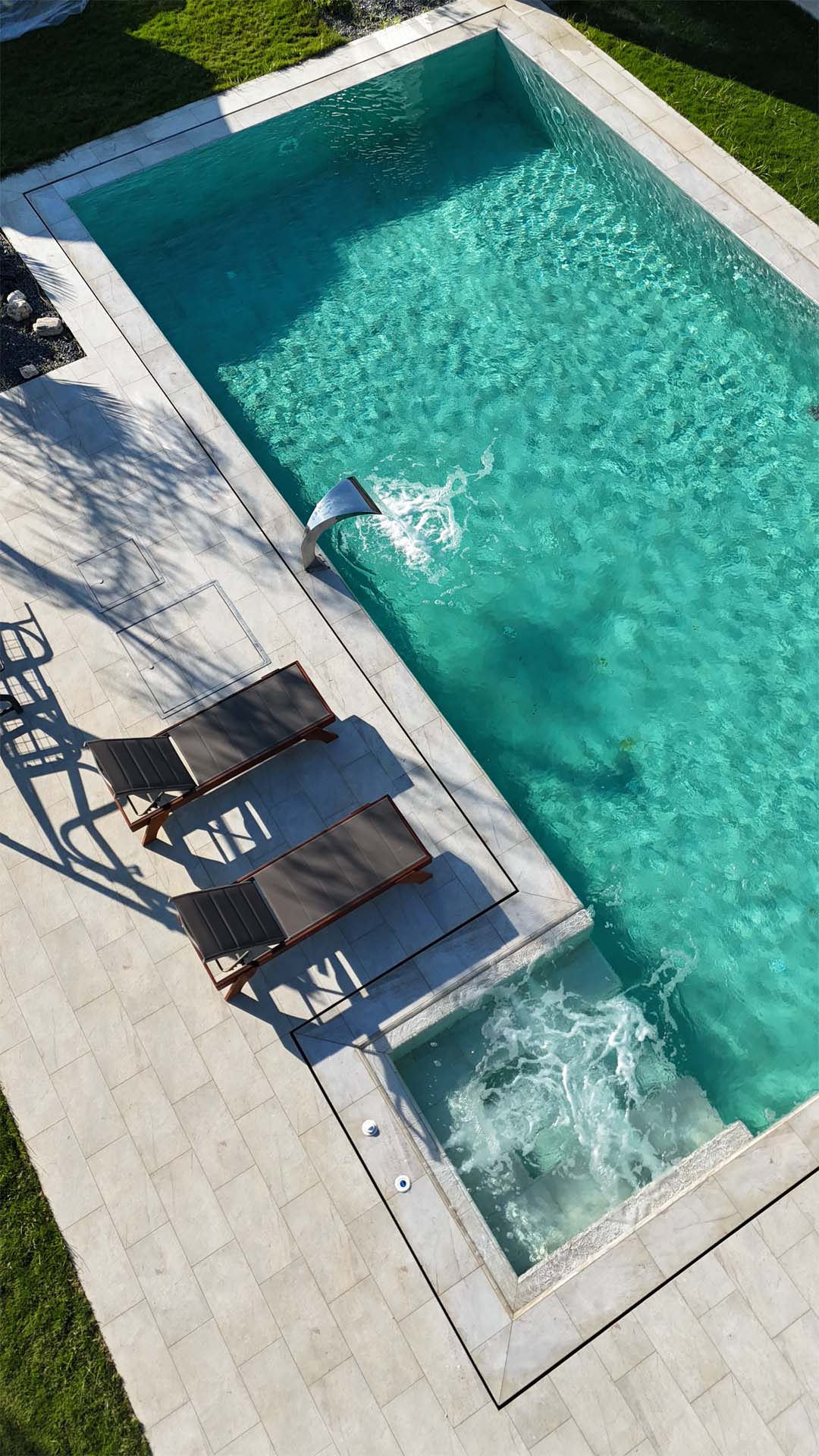 Havuzun keyif kullanımına yönelik olarak da özel detaylar eklendi. Tarafımızdan özel üretim olarak hazırlanan krom şelale, hem güçlü hem de zarif bir su akışıyla havuzun tasarımına premium bir dokunuş kattı. Ayrıca projede entegre jakuzi ve blower sistemi kurularak kullanıcıların masaj etkili bir hidromasaj deneyimi yaşaması sağlandı. Tüm bu bileşenler, havuzun sadece bir yüzme alanı olmaktan çıkıp, gerçek anlamda bir konfor ve dinlenme noktası haline gelmesine katkı sundu.