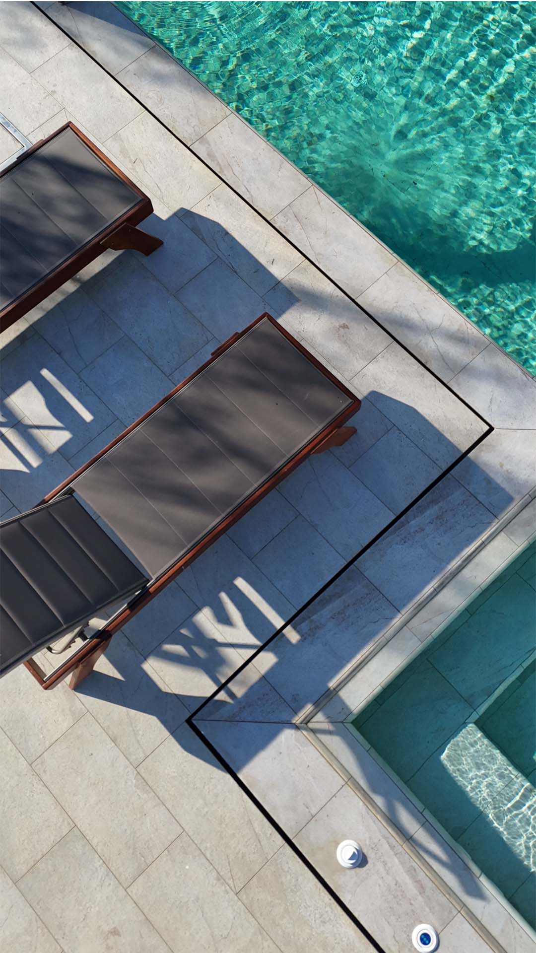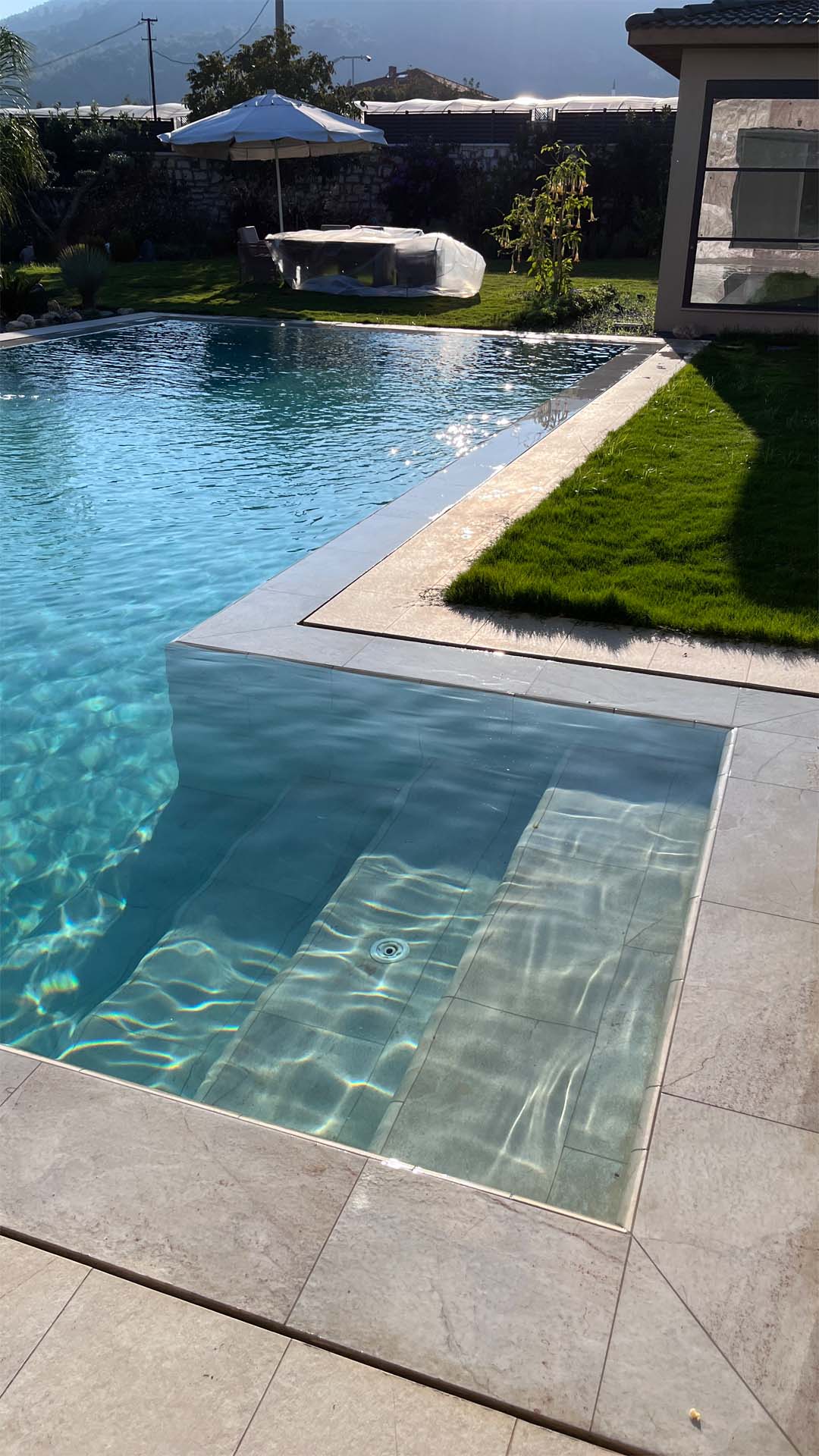 İzmir Menderes’te tamamladığımız 12 x 6 metre ölçülerindeki bu özel havuz projesi, hem mimari uyum hem de yüksek teknik standartlar ön planda tutularak tasarlandı. Projenin ilk aşamasından son teslimine kadar tüm süreç, Egeli Havuz’un deneyimli ekibi tarafından titizlikle yönetildi. Havuzun görsel bütünlüğünü sağlamak için Serapool’un Beige Stone porselen kaplaması tercih edildi. Doğal taş dokusunu modern çizgilerle birleştiren bu kaplama, hem su altında hem de çevrede oldukça sıcak ve zarif bir atmosfer oluşturdu. Havuzun kenar ve dönüş detaylarında ise yine Serapool’un Beige Stone dış bükey bordürleri kullanılarak hem şık bir geçiş sağlandı hem de uzun yıllar dayanıklılık sunan profesyonel bir bitiş elde edildi.