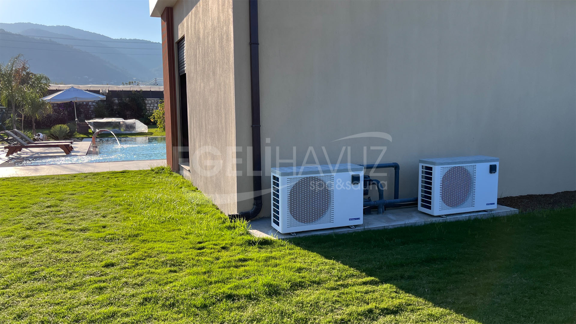 Havuzun dört mevsim kullanılabilir olması için projeye iki adet Astralpool Eco Elyo 20 kW kapasiteli ısı pompası da entegre edilmiştir. Bu yüksek verimli cihazlar, hem sezonu ciddi ölçüde uzatmak hem de istenirse kış döneminde dahi konforlu bir su sıcaklığı sağlamak amacıyla seçilmiştir. Uzaktan kontrol özelliği sayesinde kullanıcı, havuz sıcaklığını istediği an mobil cihazından yönetebilir; böylece havuz her zaman kullanıma hazır ve ideal sıcaklıkta tutulabilir. Enerji tasarruflu çalışma prensipleri ile hem ekonomik hem de sürdürülebilir bir ısıtma çözümü sunulmuştur.