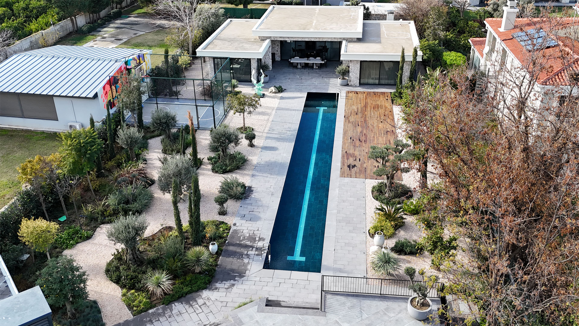 İzmir Sahilevleri bölgesinde 2024 yılında sıfırdan inşa ettiğimiz bu özel proje, profesyonel kulaç havuzu konseptiyle tasarlanmıştır.
